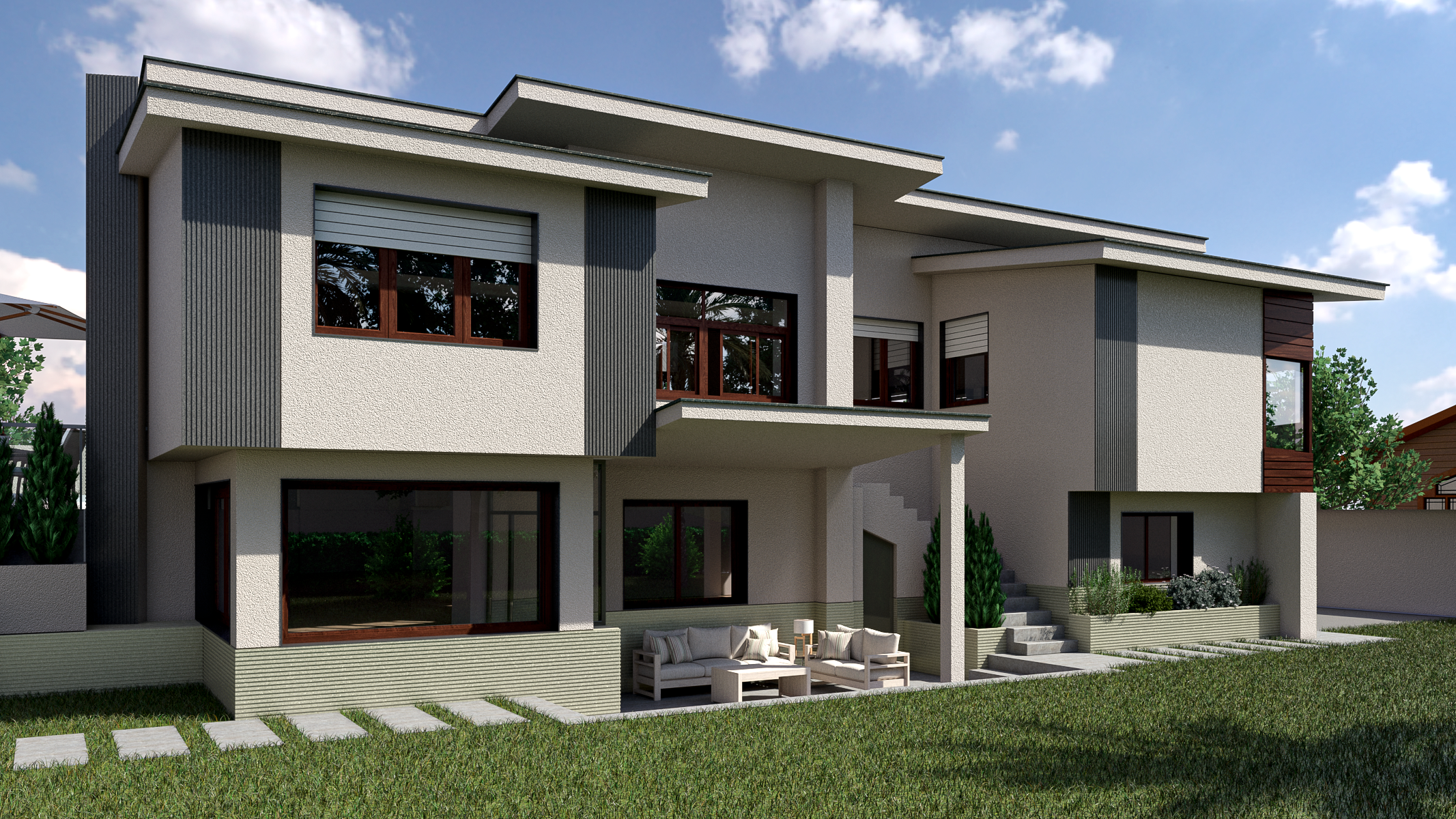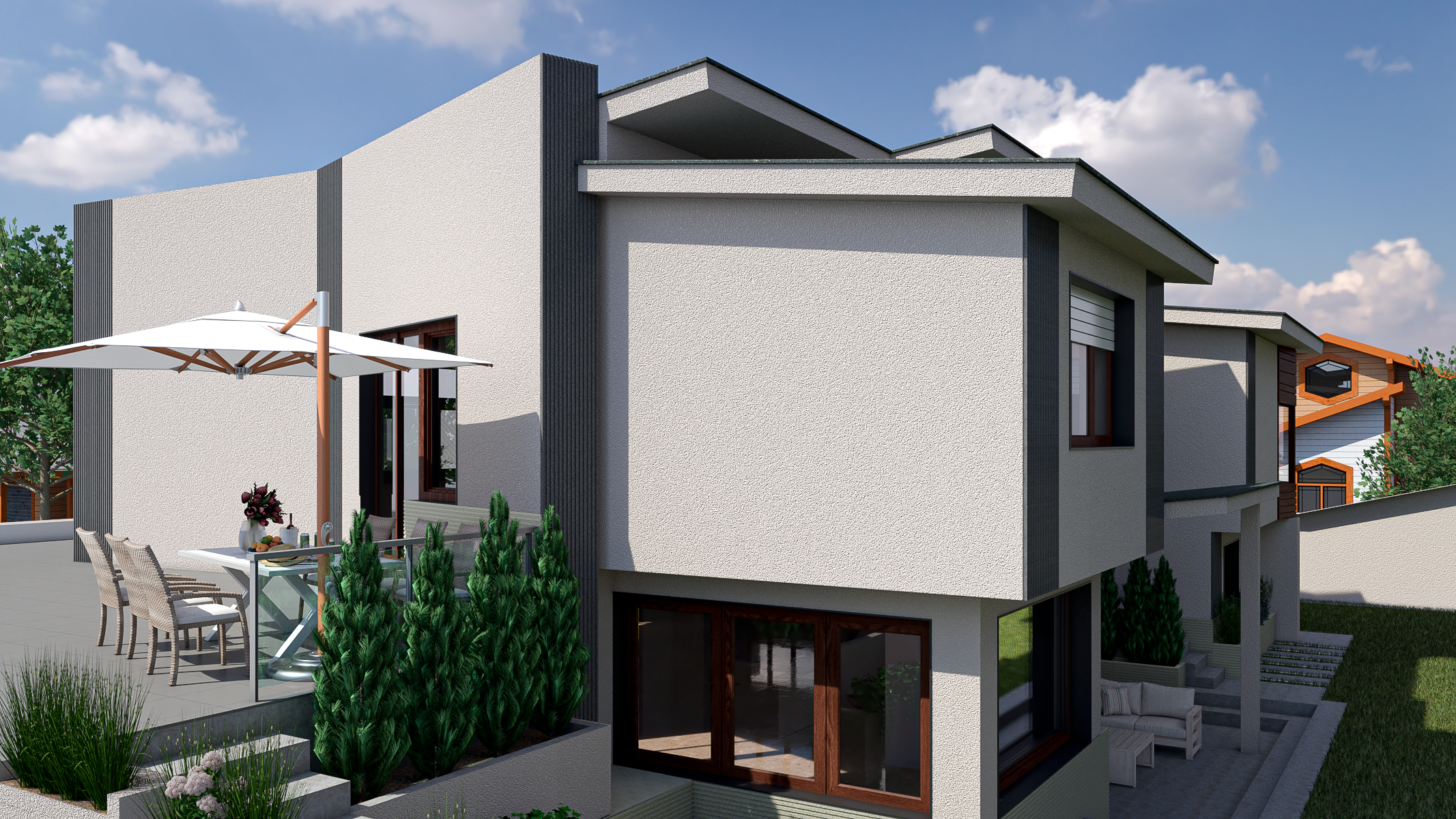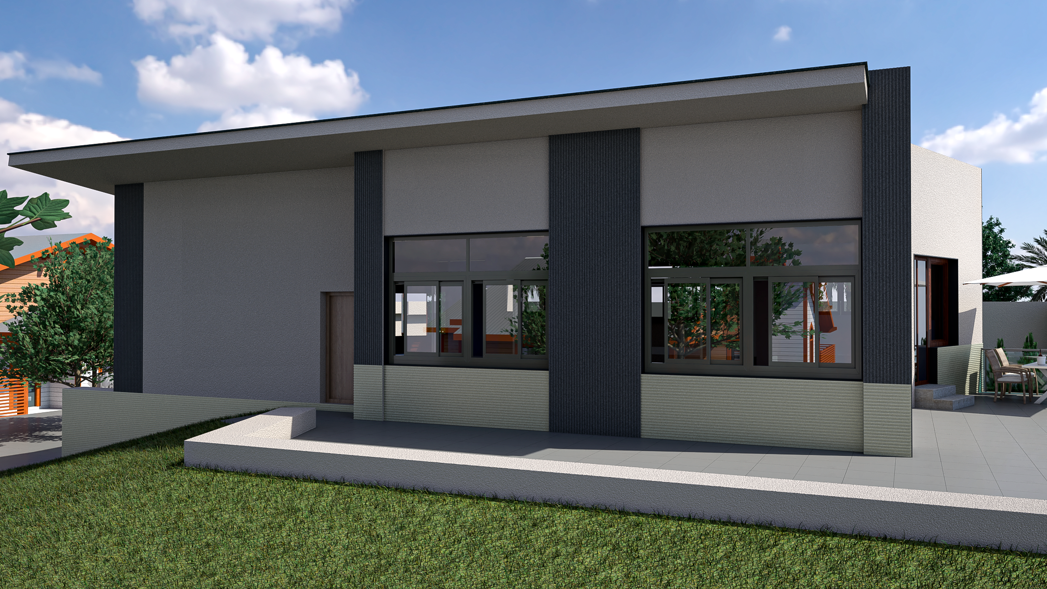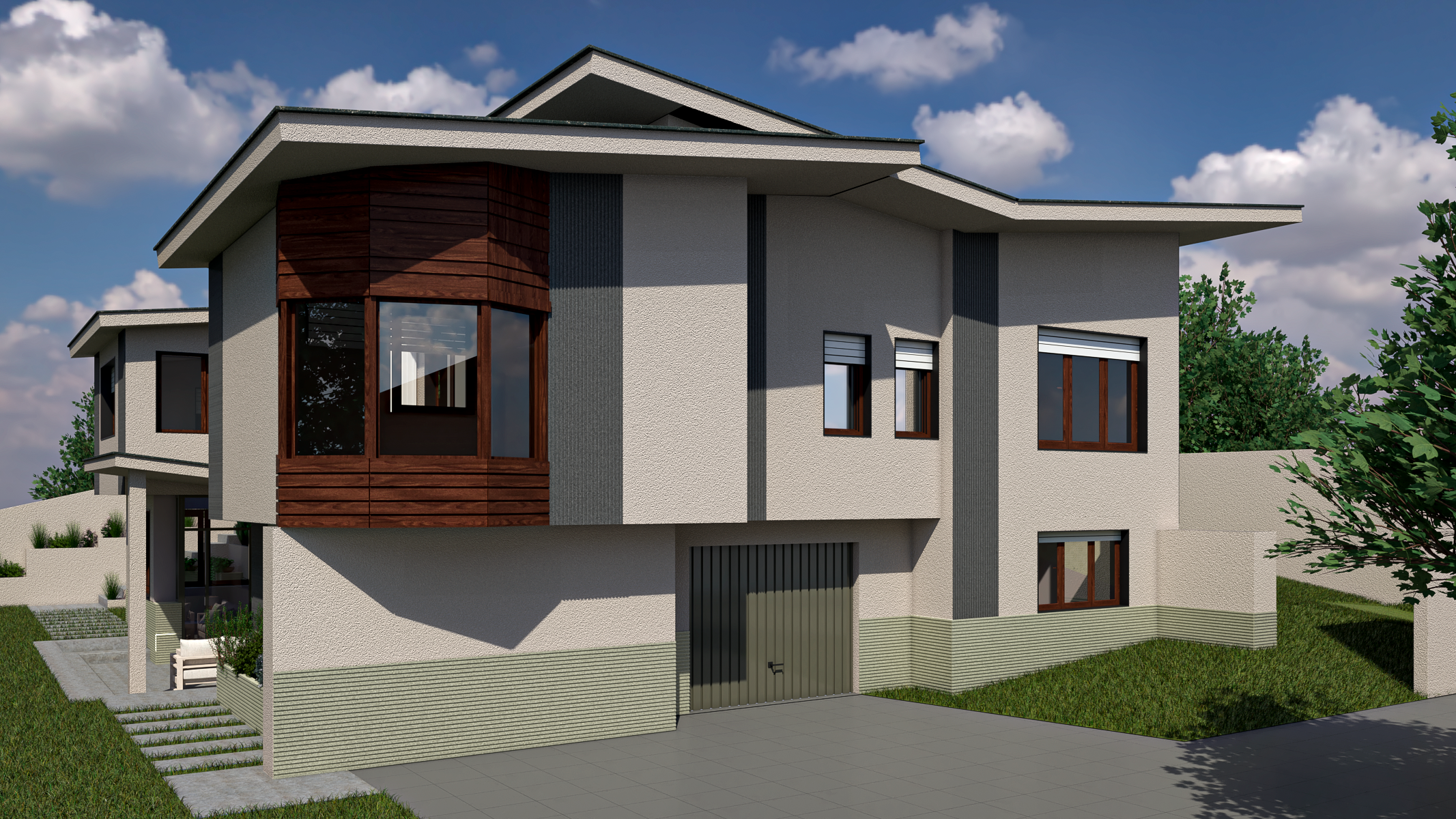 Nos ponemos manos a la obra y desarrollamos una propuesta en Sate gris claro y placas de Equitone en dos tonalidades buscando lineas verticales y horizontales.
